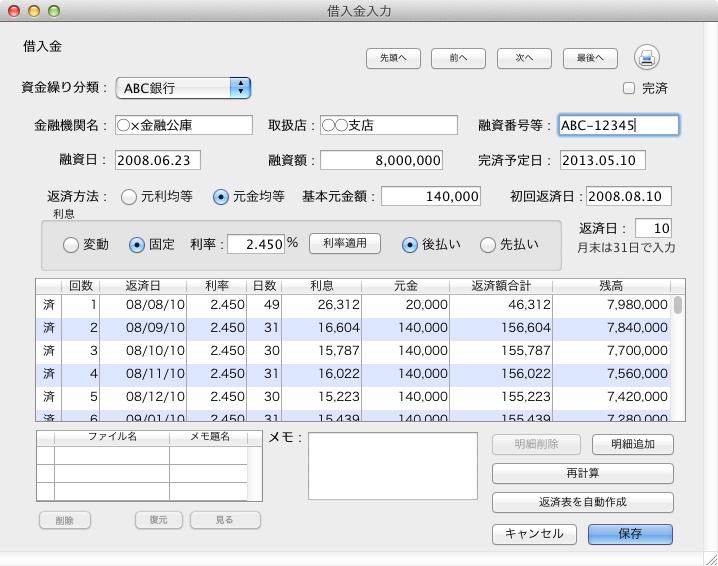 返済表の自動作成、出金予定にリンクしての管理ができます。