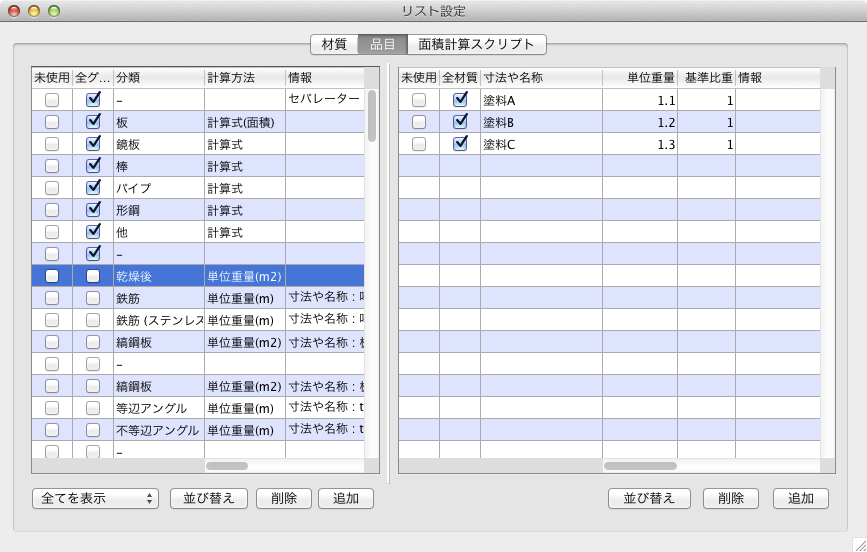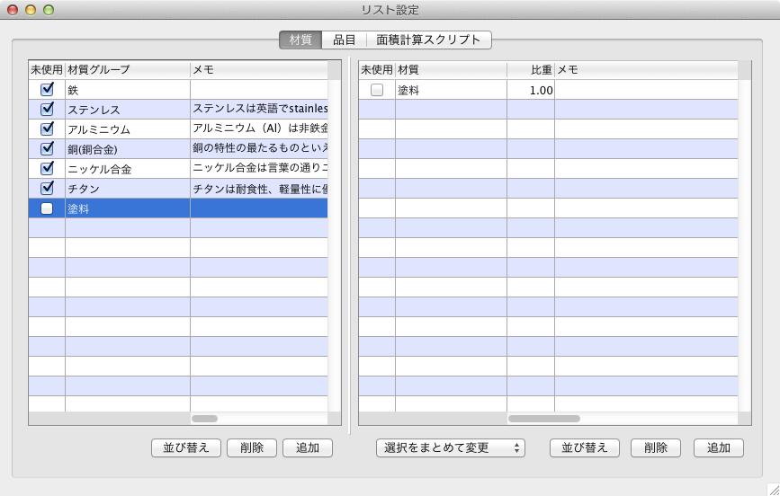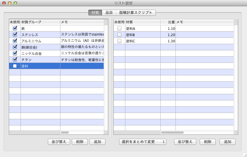 Weight Calcu Q&A 塗装の重量計算用リストの設定例